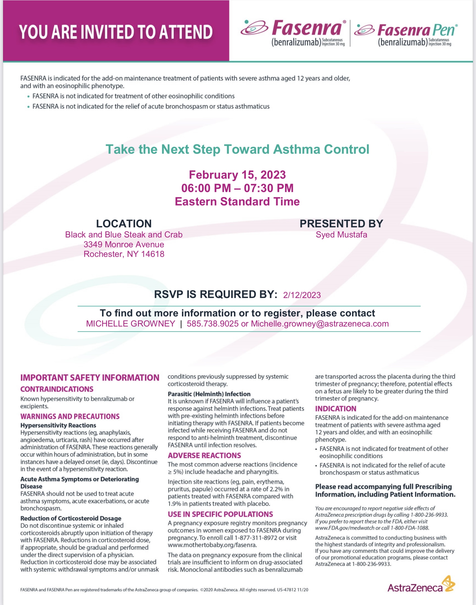 February 15 2/15 Dr. Mustafa Dinner Program – Take the Next Step in Asthma Control Membership required to view venue and time details